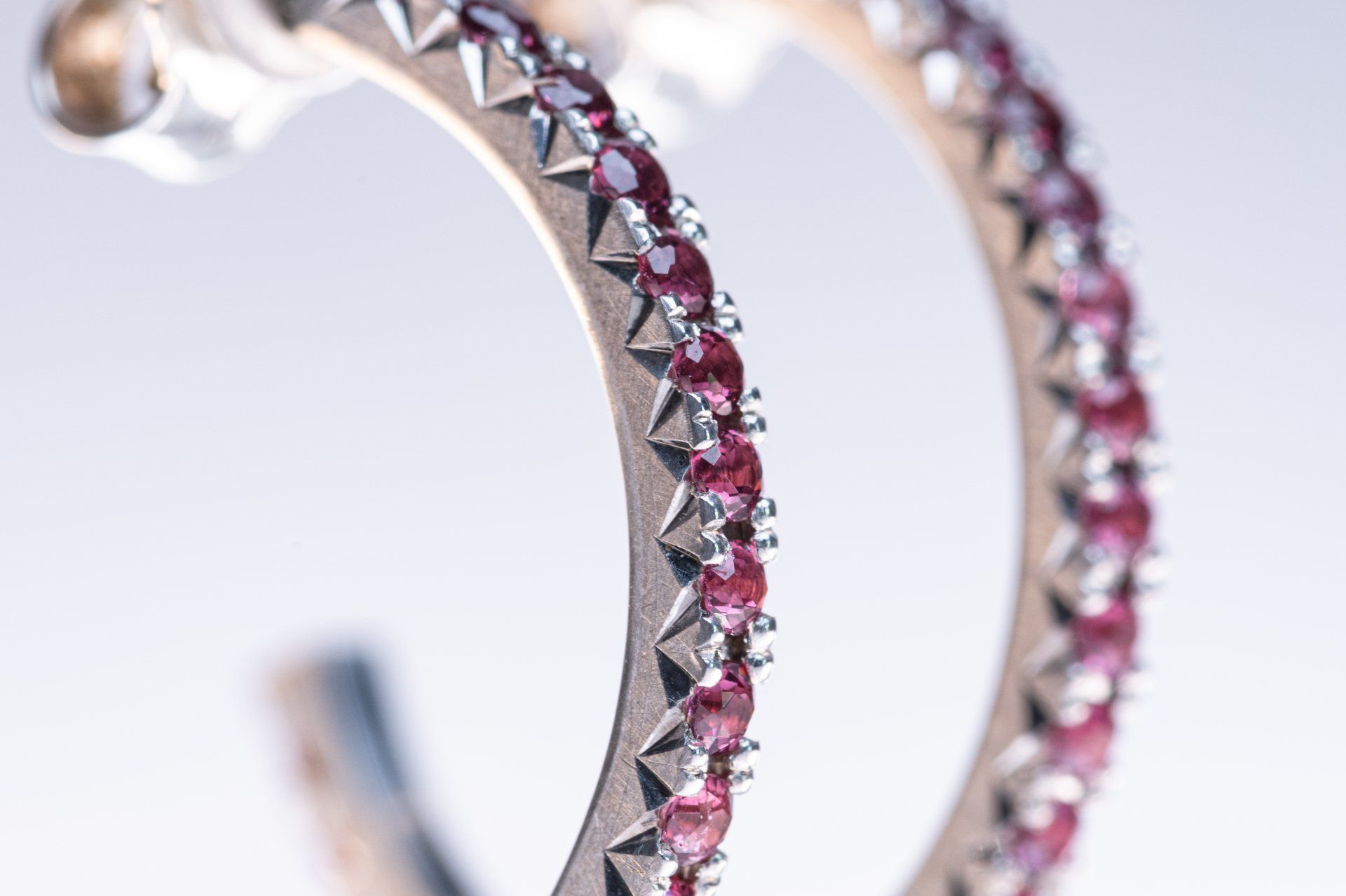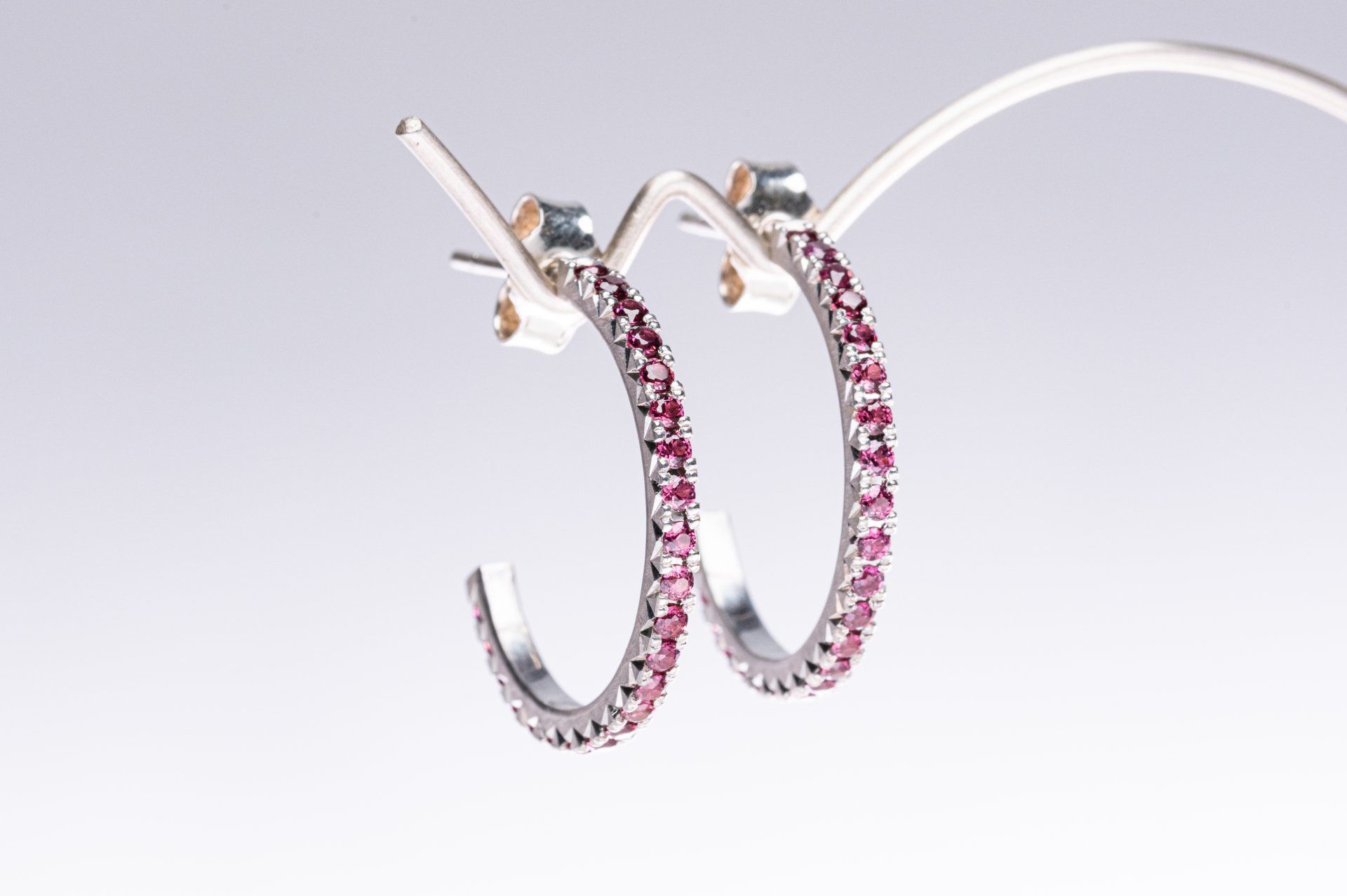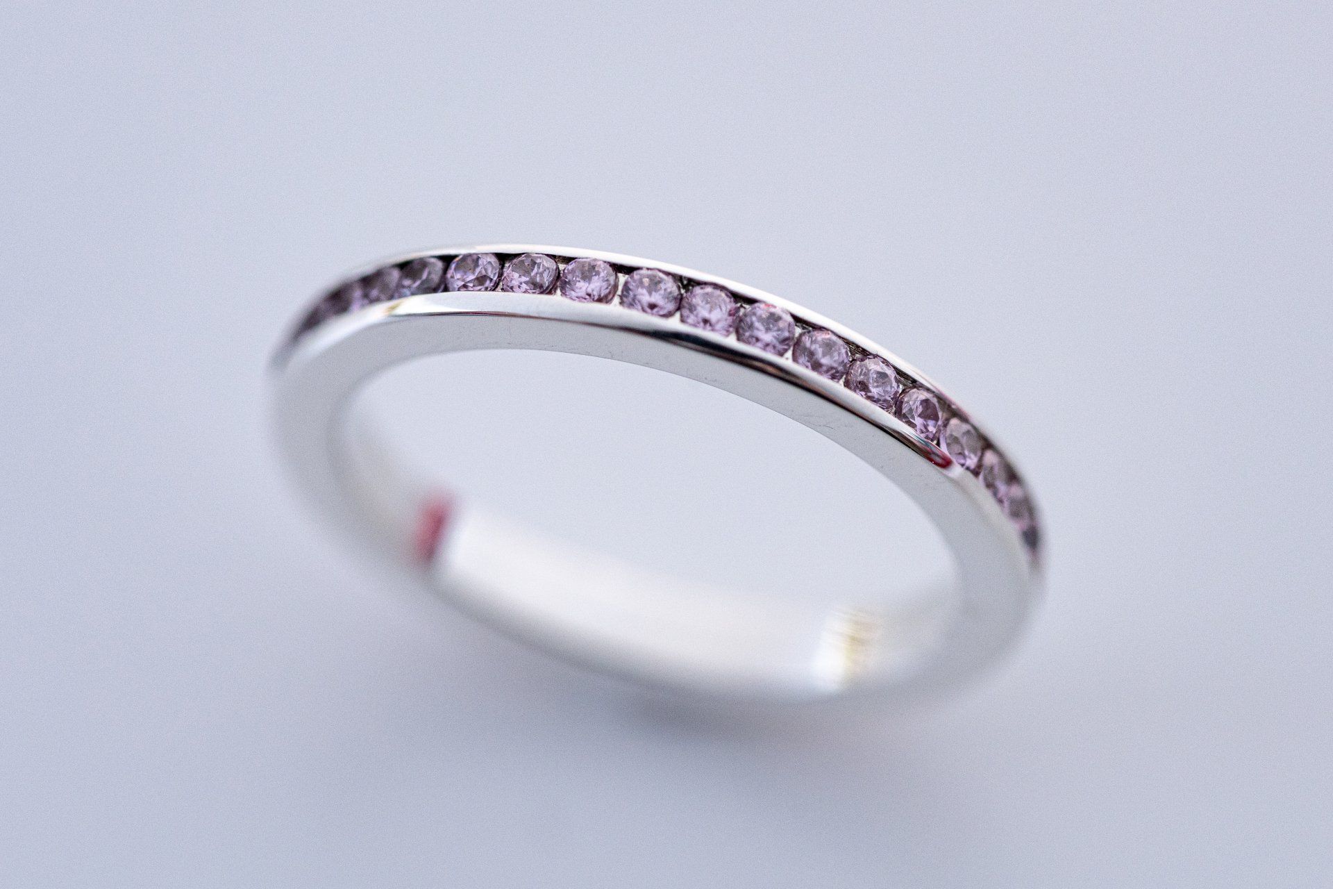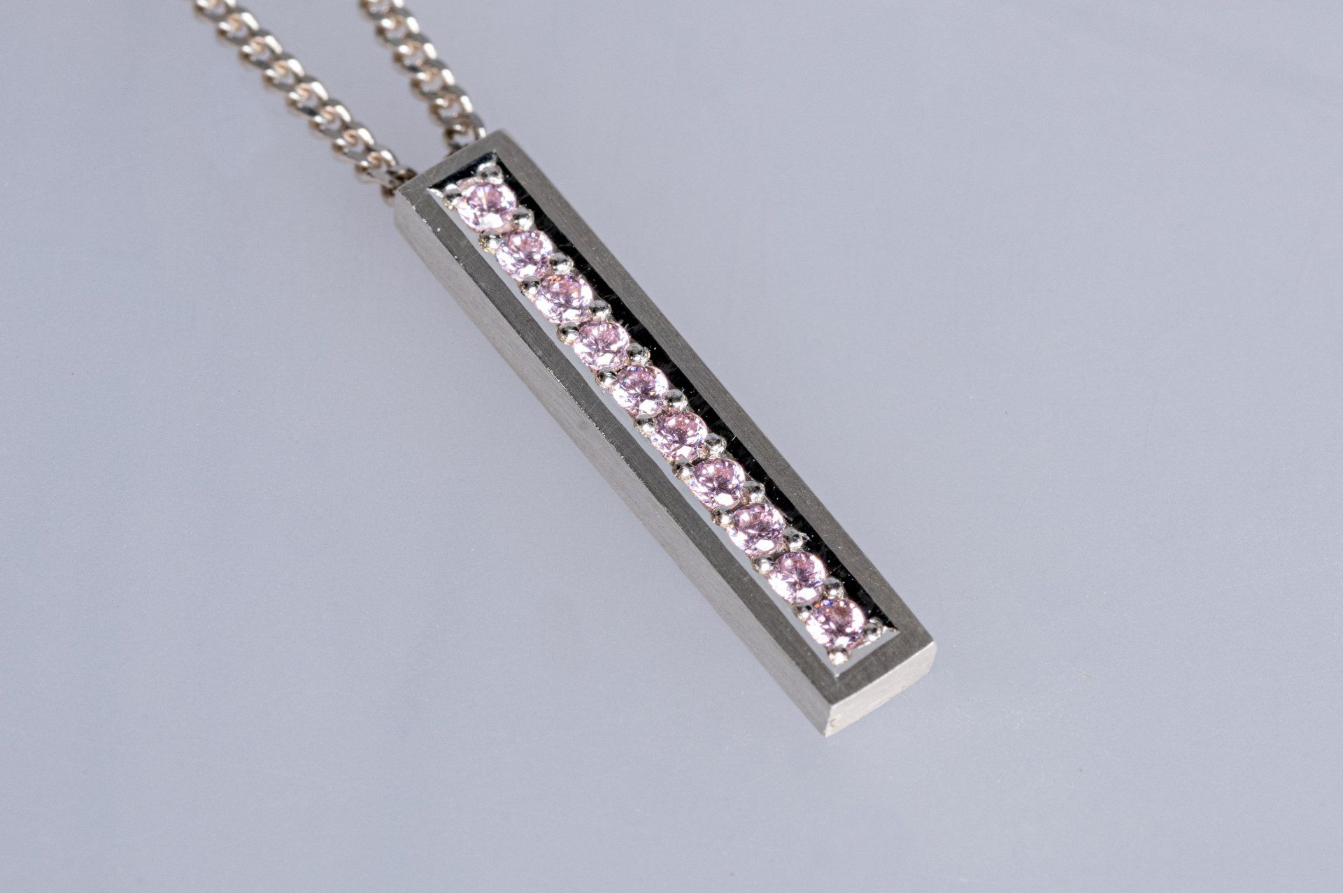 mit rosa Zirkonia als 2-Korn Faden gefasst. Steindurchmesser 1,3 mm