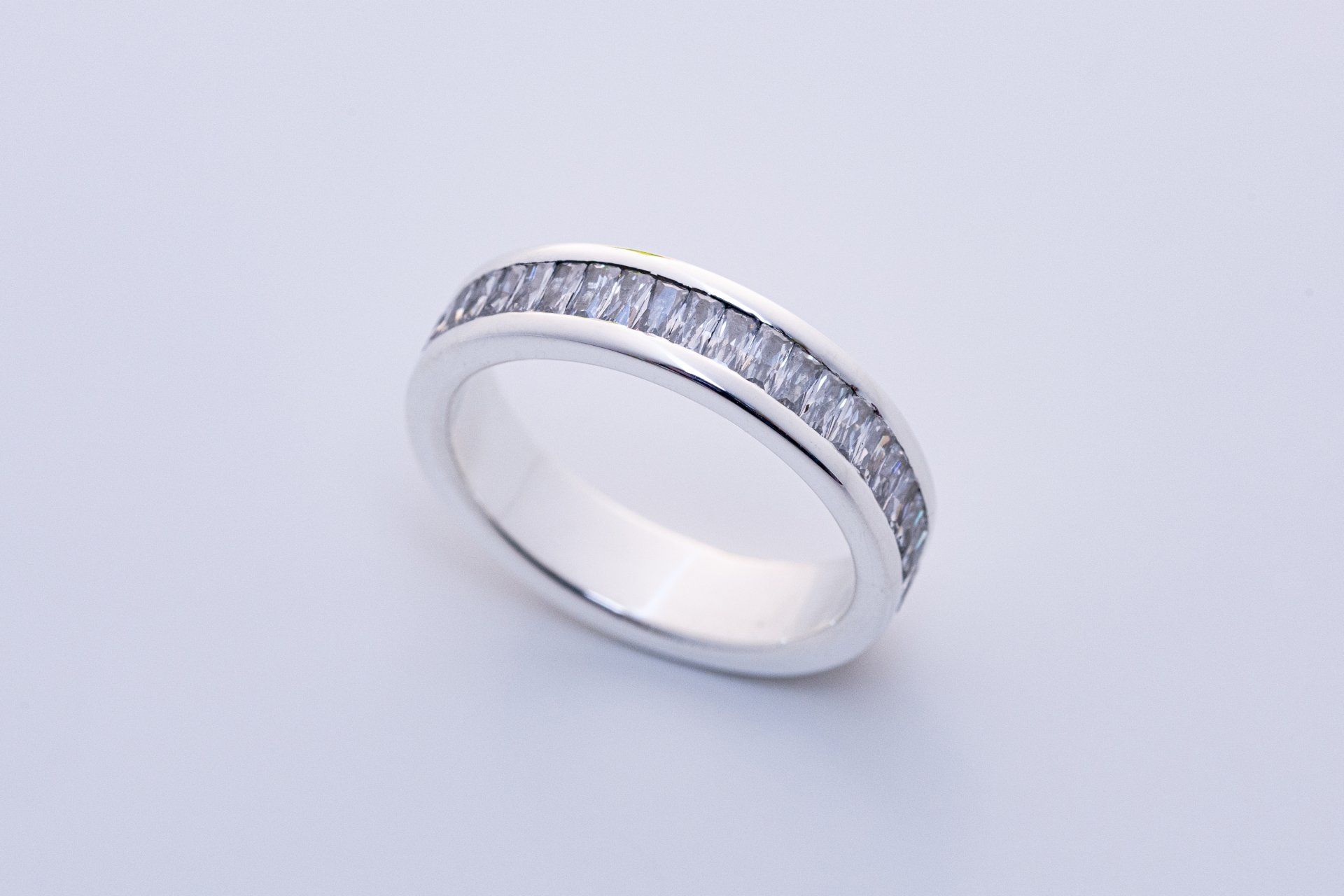 mit weißen Zirkonia (Baguetteschliff 3x1,5mm) komplett umlaufend als Kanal gefasst
